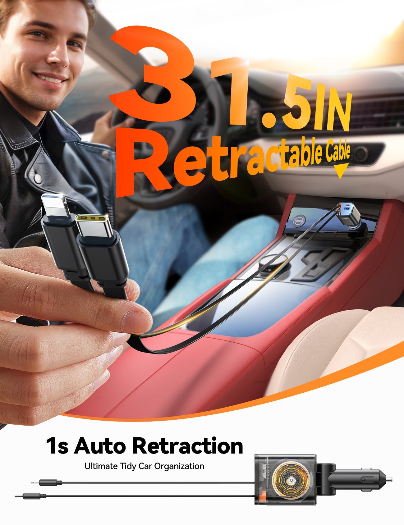 - Ultimate Tidy, Adjustable 180° Car Charger Adapter - The retractable car charger plug can be adjusted 180°