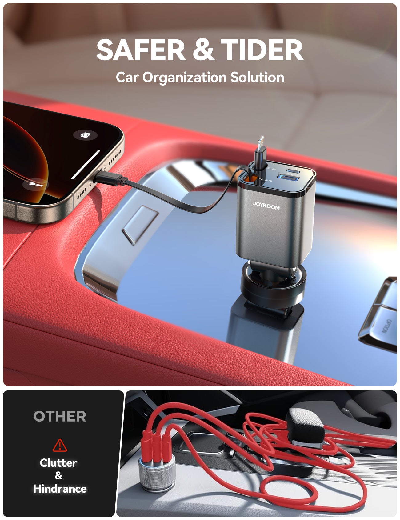 JOYROOM 4-in-1 Retractable Cable Car Charger, 65W, JR-CCL05