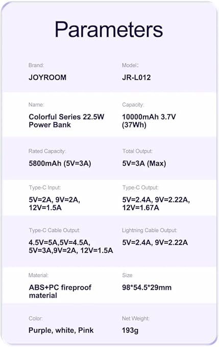 Joyroom JR-L012 22.5W mini Power Bank with Dual Cables 10000mAh