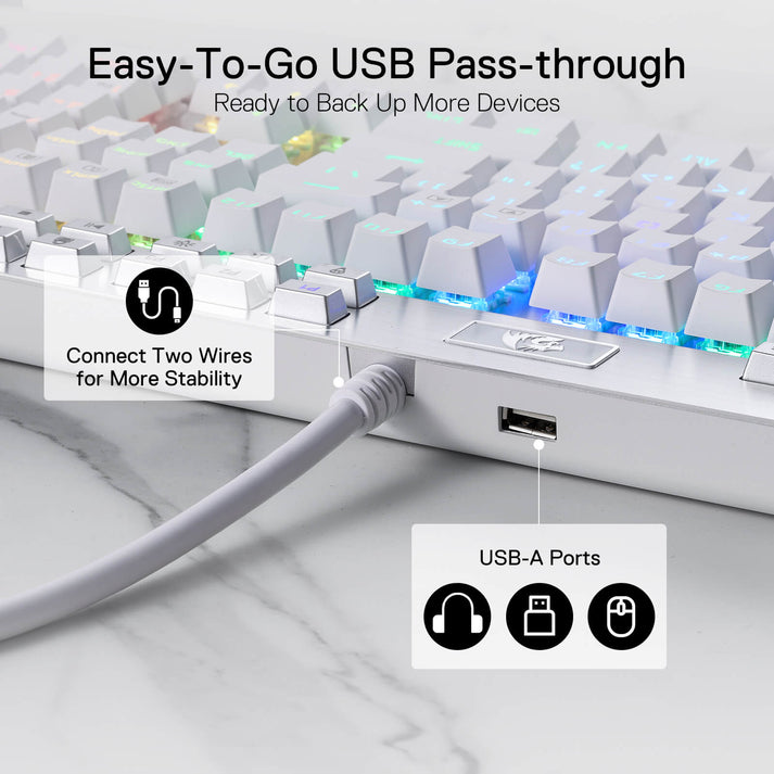 - TECHNICAL SPECIFICATIONS: - Keyboard type: Mechanical - Switch type: Outemu Purple, touch without audible click, actuation force 62g - Multimedia keys: Yes, dedicated - Dedicated Macro keys: Yes - Lock Windows keys: Yes - Keyboard size: Full Size - Wrist rest: Yes, removable - Backlit: Yes, RGB Chroma - Cable: Rubber, reinforced. Supports 12kg and 10000 push-ups. Double gold-plated USB and anti-interference filter - Matrix: 100% Anti-Ghosting with Full Key Rollover - Construction: Reinforced ABS plastic and anodized aluminum plate - Anti splash: Yes - Distribution: Spanish Latin America