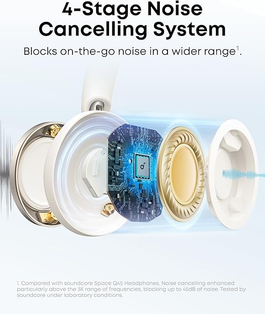 - Exclusive 4-Stage Noise Cancelling System: Enhanced and improved, soundcore’s Space One Pro Noise Cancelling Headphones target and cancel out a wider range of on-the-go noise in real time, adapting to your dynamic movements.